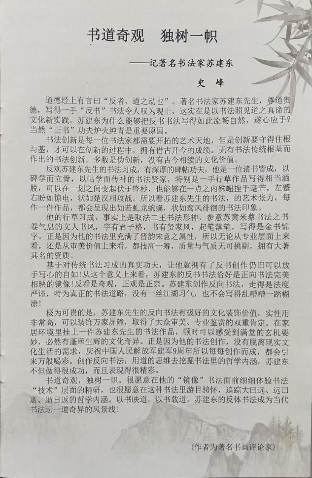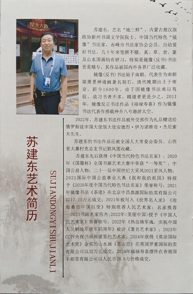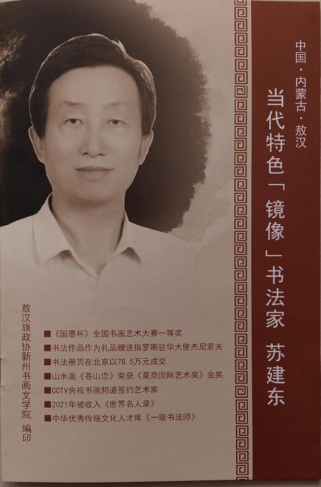 苏建东,艺名“地三鲜”,内蒙古敖汉旗政协新州书画文学院院士、中国当代特色“镜像”书法家,赤峰市书法家协会会员,自幼爱好书法,几十年来笔耕不辍,真、草、隶、及山水国画均有研习,特别是镜像(反书)书法更是精专,其作品被国内外各界广泛收藏。