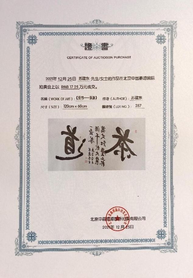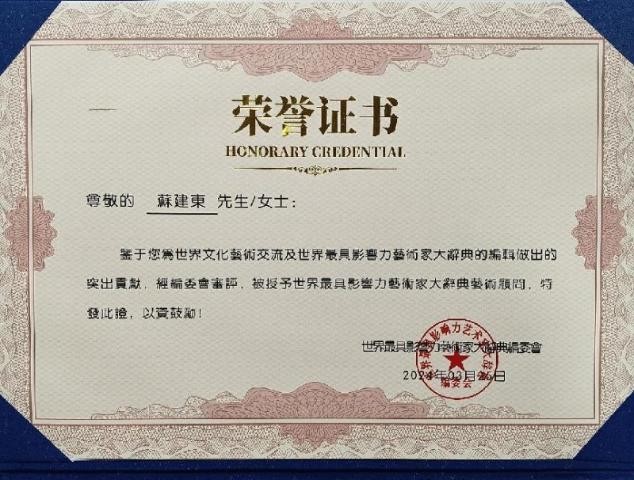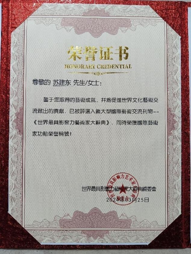 苏建东先后获得《中国当代特色书法名家》;2020年《国墨杯》全国书画艺术大赛中荣获“一等奖”;中国公益人物;二十一届中国世纪大采风2021采风人物;2021国际中国公益事业大典《我和我的祖国》特授予《2020年度中国当代特色书法名家》荣誉称号;2021年镜像书法《茶道》在北京中昌鼎源国际拍卖有限公司以17.25万元成交;2021年被写入《世界名人录》《沧海桑田中国巨变》特别推荐人民艺术家;名家推荐-2023书画名家百杰;2022年<美丽中国>授予《中国人民艺术家》荣誉称号;2022年《热血铸军魂,庆祝中国人民解放军建军95周年》被评《著名艺术家》;2023年CCTV央视书画频道签约艺术家;2024年获得《莫奈国际艺术奖》金奖的山水画《苍山恋》在英国罗素国际拍卖有限公司以32万元成交;2024年福禄寿喜摆件在香港国丰拍卖有限公司以人民币28.8万价格成交。同年6月一套书法册页在北京传世水墨拍卖会上以78.5万元成交,2024年9月,两幅镜像书法《宝地生金》和《仁义礼智信》在佳士得国际拍卖公司分别以26万元和22万元的价格成交;同年9月,一幅山水画《苍山恋》荣获《莫奈国际艺术奖》金奖。大部分作品已被国内外各界收藏家,企业家收藏!