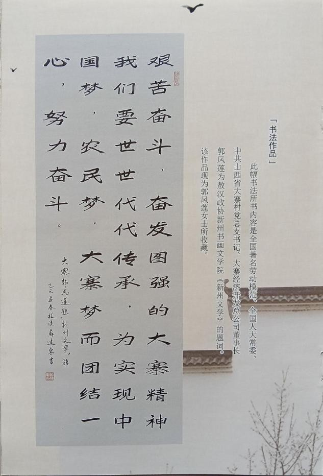 苏建东的书法作品还被全国人大常委会委员、山西省大寨村党总支书记郭凤莲收藏。