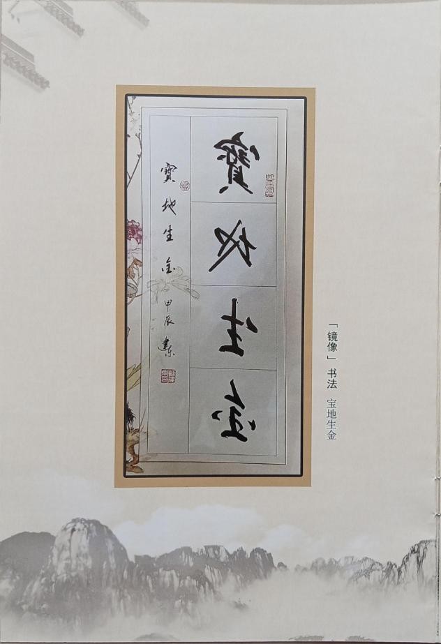 镜像(反书)书法始于南朝,代表作为南朝梁萧景神道阙著名刻石,清代晚期出土于南京,距今1600年。由于因镜像书法难以驾驭,故习书者不多,精道者更是少之。2011年,镜像反正书法作品《福禄寿喜》作为镜像书法代表作搭载神舟八号遨游太空。