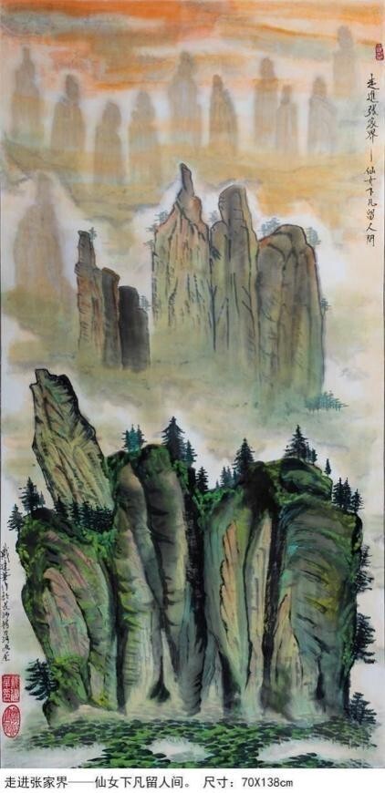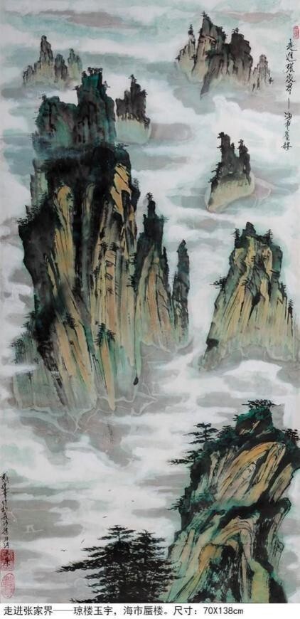 從他用時兩年創作的足以震撼中國畫壇,具有史詩級的百 米山水畫長卷《壯美山河一一走進張家界》中可以看出,其中既有中國畫講究的意境和神韻,又有西畫所追求的重 實和背景,油畫、水彩、寫 意、工筆諸多繪畫技法相互邦 襯,用墨幹、濕、濃、淡把握有度,用筆勺、皴、擦、染、點手法運用自如,。畫作中看似隨意的潑彩潑墨,洽 到好處地營造出山巒溝壑的崢嶸險峻、蒼潤與堅實,不經 意的淡彩談墨拖拽,將畫面視野延伸到不盡的遠方,或濃 或淡的白粉塗抹形成的浮雲霧霾,讓溝谷山巒時隱時現, 變得神密莫測,或重或輕的墨點潑灑與或長或短的線條勾 勒穿扦,讓草地叢林突現,讓川流瀑布飛灑。他的画作被 收入中国国家“艺术大家檔案”。