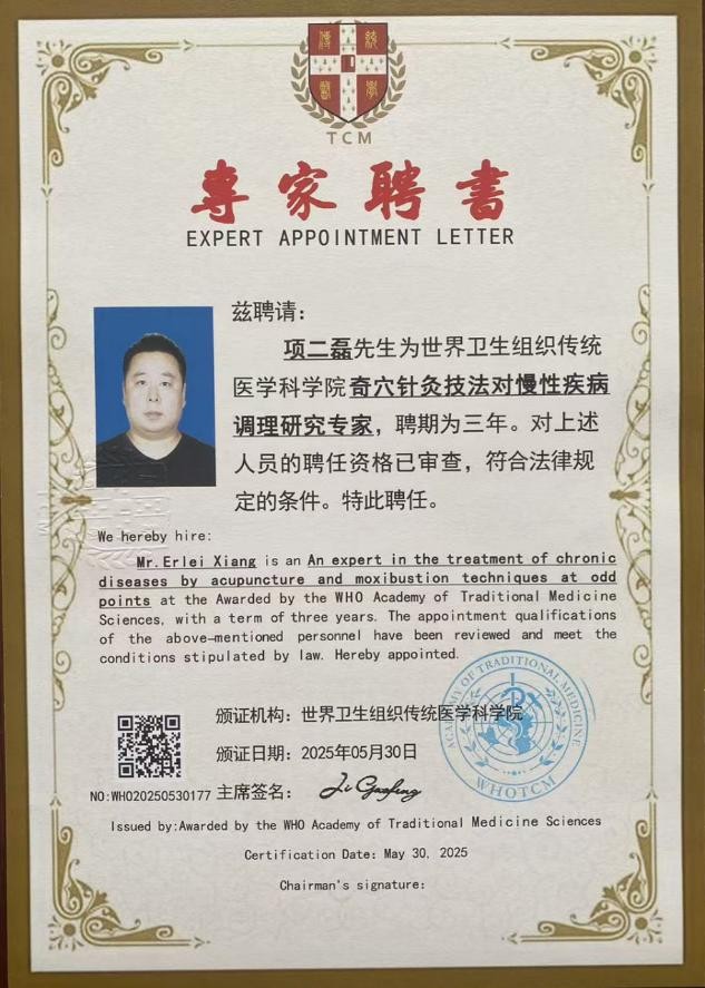 这些案例不仅验证了针灸的疗效,更彰显了中医“整体观”与“个体化治疗”的智慧。项二磊并未止步于临床,而是将经验转化为知识产权:截至2025年,他已申报10项国家级中医药发明专利(如“一种治疗心脑血管的中药组合物”“一种缓解乳腺结节的中药丸”),并获得欧洲荷兰、卢森堡、南非等5项国际专利。尤为值得一提的是,2025年5月,项二磊先生凭借其在奇穴针灸技法对慢性疾病调理领域的卓越贡献,成功入围世界卫生组织传统医学科学院专家名录,这一国际认可不仅为中医针灸的全球化传播再添重磅砝码,更标志着中国传统医学智慧正式进入全球健康治理的核心舞台。这些成果不仅保护了传统医学的知识价值,更为其全球化传播奠定了法律基础。