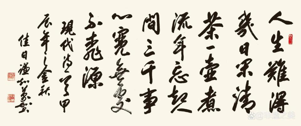 行草书是赵万和最擅长的书体,其线条劲道圆润,如惊蛇入草,游龙惊鸿,豪迈大气,有长江之水滔滔不绝,一泻千里之气象。他的行书用笔讲究,结字正欹互生,形态端丽遒美,婉畅多姿,书写不疾不缓,亦疾亦缓,展现出高超的节奏掌控能力。而他的草书则挥洒自如,收放有方,舒展有致,缭绕酣畅,既有悠闲妍美之风范,又不失一泻千里之气势。欧阳中石先生曾评价道:"赵万和的书法有游龙惊鸿之态,腾蛟起凤之气势,尤其注重笔墨功力与文字纬度的统一结合。"
