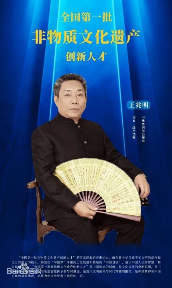 王兆明(书法家诗人)号梨园墨客,1949年9月出生于北京昌平。自幼酷爱书法,八五年毕业于无锡书法艺专,曾先后受教于辛济仁、权希军、欧阳中石、何玉璋等著名书家,作品曾多次在国内书展和比赛中获奖。现为国家一级书法师,中华诗词学会理事、全球汉诗总会副会长兼北京联络处主任、原北京风雅诗社社长、中国民间文艺家协会会员、中国书画家联谊会会员、北京收藏家协会会员、中国教育电视台《水墨丹青栏目》、《名家讲堂栏目》签约艺术家、北京京华阁书画院副院长、中国西部画院副院长、全国老干部健康指导委员会委员。2000年荣获北京市第二届家庭读书藏书状元;2007 年当选2006年度京郊十大新闻人物;2013年荣获北京市第三届十大示范书香家庭。他的事迹多次被中央电视台、中国教育电视台、北京电视台、北京广播电台《北京日报》、《工人日报》、《中国农民报》等多家媒体专题报道,专注书法领域六十余年,擅长写福寿,为了写好福字,坚持在墙上用水写壁四十余载,人称“京北福寿王”,2016年王兆明先生的福,寿两副作品曾随长征七号火箭遨游太空,被媒体称为“天宫赐福”,“寿与天齐。2024年10月王兆明先生被中国中外名人研究会推荐,为纪念全国人民代表大会成立70周年,中南海怀仁堂特邀作为代表参加为羊脂玉瓷茶具,并且出版《翰墨丹青映丰碑》封面人物画册,入编人员:范曾、王兆明、何家英、吴为山、范迪安、孙晓云、潘公凯。其书法作品曾先后在全国数十家报刊杂志发表,并被四十多个国家的友人收藏。