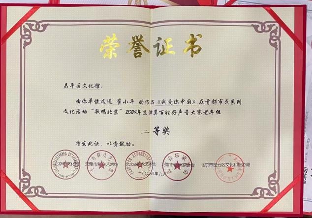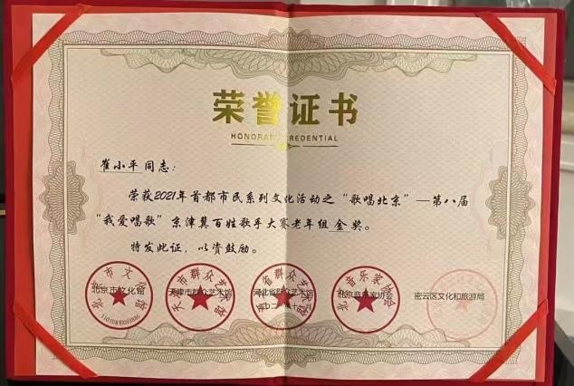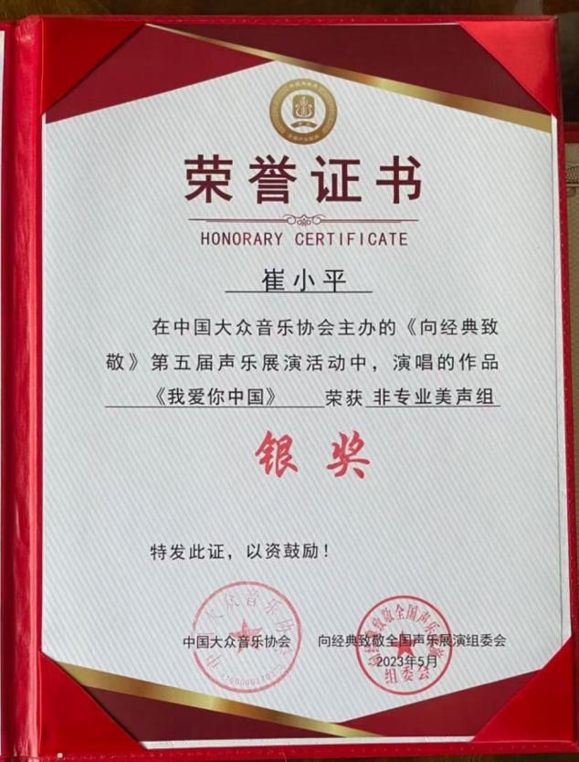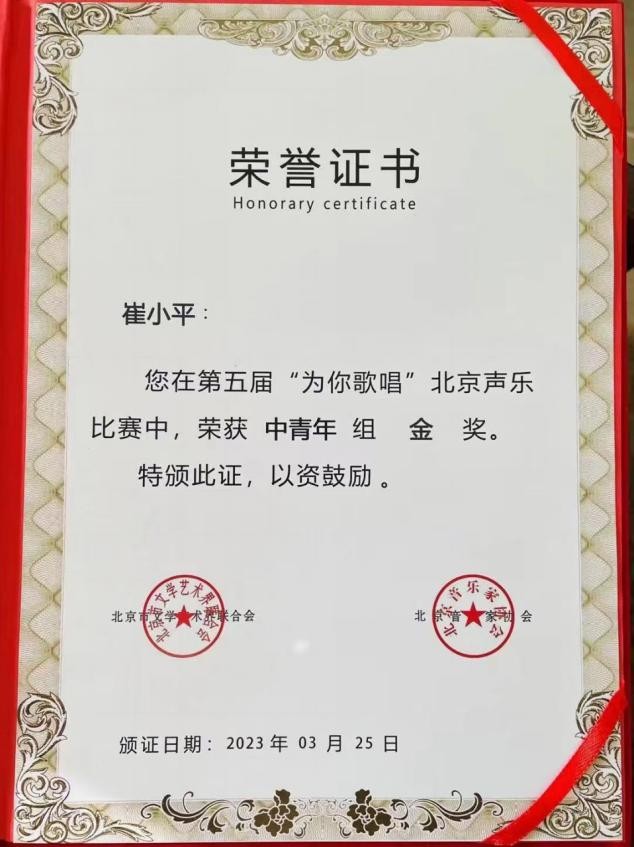 2023年北京音协与文联举办的第五届歌唱大赛获金奖.