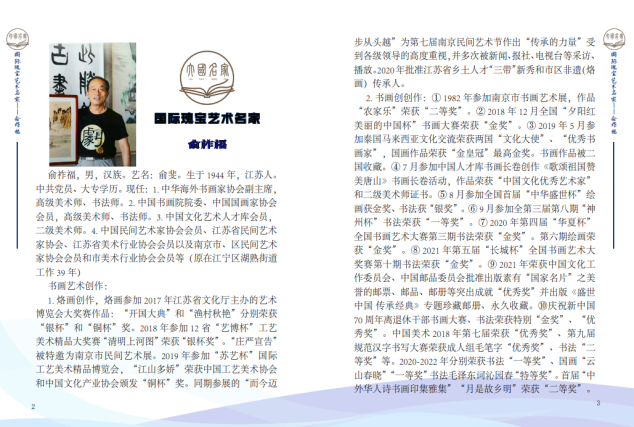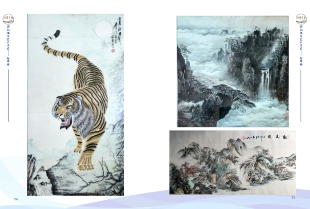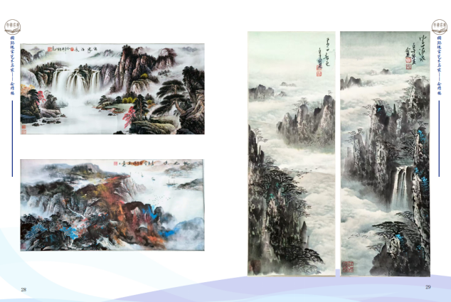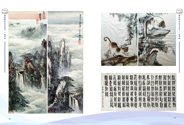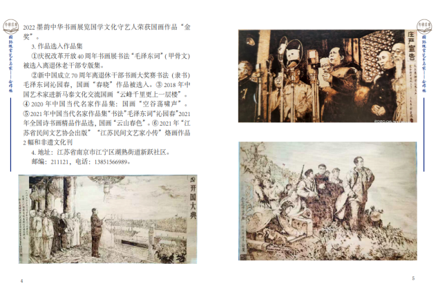 ②新中国成立70周年离退休干部书画大奖赛书法(隶书)毛泽东词沁园春,国画“春晓”作品被选入。③2018年中国艺术家进新马泰文化交流国画“云峰千里更上一层楼”。④2020年中国当代名家作品集:国画“空谷荡啸声”。⑤2021年中国当代名家作品集“书法”毛泽东词“沁园春”2021年全国诗书画精品作品选,国画“云山春色”。⑥2021年“江苏省民间文艺协会出版”“江苏民间文艺家小传”烙画作品2幅和非遗文化刊
