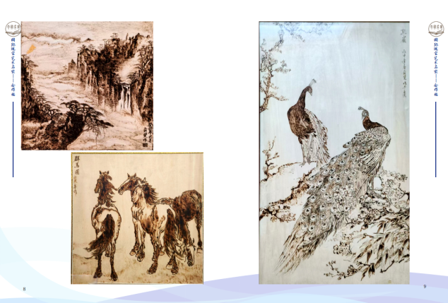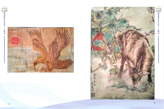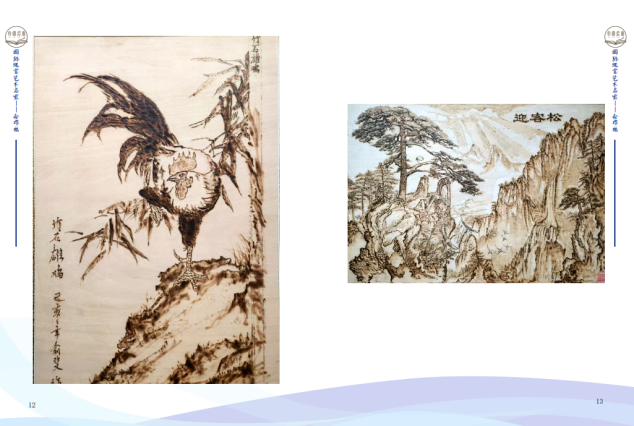 二、书画艺术创作:1.烙画创作,烙画参加2017年江苏省文化厅主办的艺术博览会大奖赛作品:“开国大典”和“渔村秋艳”分别荣获“银杯”和“铜杯”奖。2018年参加12省“艺博杯”工艺美术精品大奖赛“清明上河图”荣获“银杯奖”。“庄严宣告”被特邀为南京市民间艺术展。2019年参加“苏艺杯”国际工艺美术精品博览会,“江山多娇”荣获中国工艺美术协会和中国文化产业协会颁发“铜杯”奖。同期参展的“而今迈步从头越”为第七届南京民间艺术节作出“传承的力量”受到各级领导的高度重视,并多次被新闻、报社、电视台等采访、播放。2020年批准江苏省乡土人才“三带”新秀和市区非遗(烙画)传承人。
