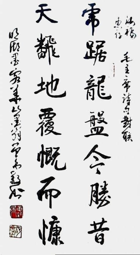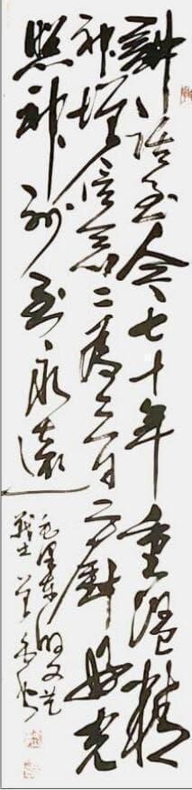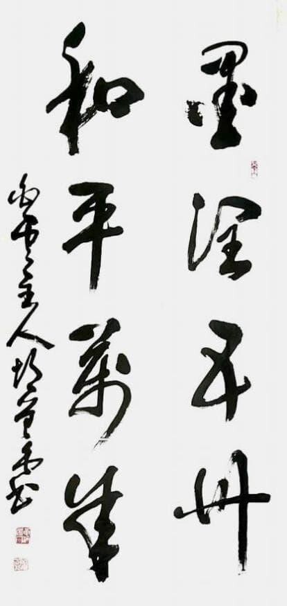 胡曾禹先生的书法堪称一绝。其书作雄浑苍茫、气 势磅礴、思与神合、具有抽象笔墨意味的经典之作, 他以丰厚人生阅历和学识修养为底蕴,以臻于化境的 笔墨功夫作支撑,一破此前的因袭摹古和法度束缚, 因心造境,以手运心,写书法以神遇而不以目视,足 见先生的艺术功力和成就非同一般。观先生的作品, 带给人们的是一番惊奇和震撼,是一种天风海涛、真 力弥漫、恢宏壮阔的审美感受!点画之间,俯仰之际, 凝聚着书家七十年的心血、智慧,展示了他精湛的功 力和不寻常的艺术成就。放眼望去,只觉得朗朗清风 扑面而来,引人入胜:如风卷云舒,气象万千 ;如虹飞 岫出,瑰丽灿烂 ;如群马奔啸,腾尘起雾 ;如高山飞瀑, 一泻千里;如石壁挂藤,蛇引碗动……倘无对线条的控 制达到百炼钢化为绕指缠的能力,诉诸视觉上的感受是不可能有如此强烈的。在笔法上也达到了前无古人 的境界,胡曾禹先生的书法,层层深厚,气势磅礴, 惊世骇俗,这一显著特点,也使中国的书法上升到一 种至高无上的境界。他的书法,敷色不多,他清楚, 黑白二色,表达的亦是一虚一实、一动一静,相生相 发,相反相成,是中国传统文化的一种深刻表现。