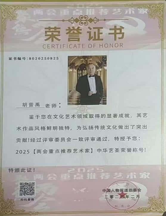 中国艺术代言人胡曾禹正是我们民族精神的代 言人。他是我们心灵的寄托,是我们情感的纽带, 是我们文化自信的根基。让我们一同走进中国艺 术的殿堂,感受其领袖风范的格局,领略其天下 文化的魅力。在这片艺术的海洋中,汲取力量, 传承文明,共同书写属于我们的文化传奇,让中 国艺术的光芒,永远闪耀在世界的东方!