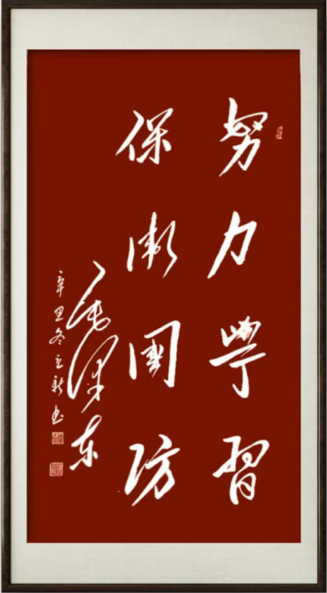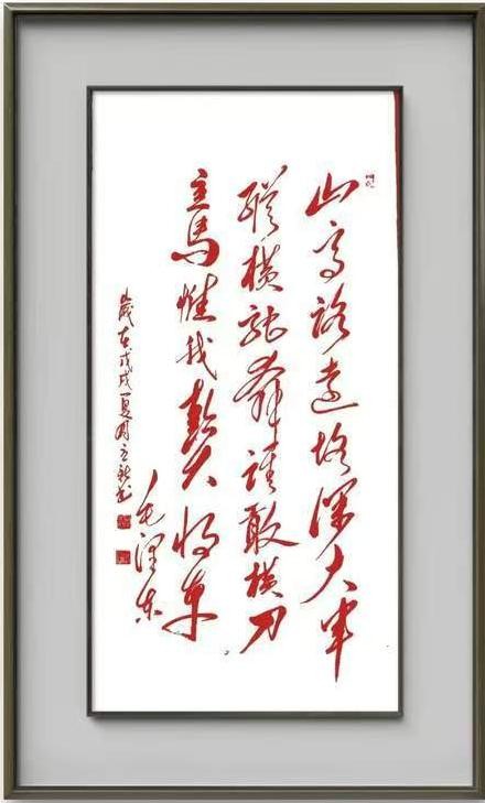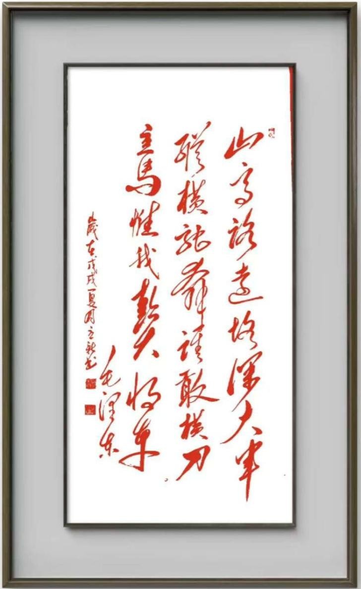 在深入研究毛体书法的过程中,潘立新先生不是模仿毛体草书的笔迹形态,而是要在书法精神层面上达到共鸣。毛体书法以独特的魅力和深厚的文化底蕴,在近现代中国书法史上占有重要地位,既展现了个人的情感表达,又蕴含着强烈的革命精神正能量。潘立新通过对毛体书法的深入探索,不仅继承了豪放大气的风格特点,还在此基础上融入了自己的理解和笔墨个性,形成了既有历史厚重感又充满时代活力的独特艺术风貌。