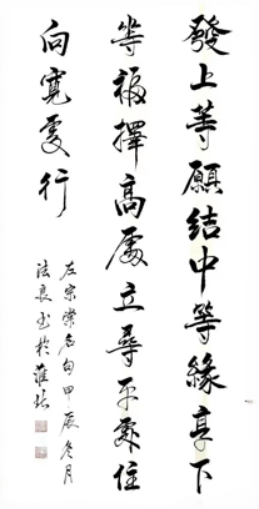 梅法良先生的书法风格独具特色,可谓博采众长又自成一体。从笔法上看,他深得传统书法精髓,每一笔都力透纸背,尽显扎实功底。中锋用笔稳而有力,线条圆润饱满,如 “锥画沙” 般具有立体感与质感。转折处,提笔顿笔间衔接自然流畅,既有颜体楷书的雄浑大气,又不失欧体的险峻挺拔。在书写行草书时,笔画灵动多变,似行云流水,一气呵成,颇有 “一笔书” 的韵味,这不禁让人联想到怀素《自叙帖》中那种自由奔放又不失法度的笔意。例如他的书法作品《路虽远行则将至,事虽难作则必成》,开篇起笔沉稳,笔画厚重,犹如苍松扎根大地,奠定了作品坚实的基调;随着书写推进,笔画逐渐灵动起来,线条的粗细、疏密变化丰富,似山间蜿蜒的溪流,自然而富有韵律。在结构布局上,梅法良先生巧妙构思,作品呈现出独特的美感。他的楷书作品,结构严谨规整,每一个字都仿佛精心雕琢的艺术品,笔画之间相互呼应,比例协调,犹如建筑般稳固而不失灵动。而在行草书作品中,他大胆打破常规,字与字之间或连或断,欹正相生,通过巧妙的留白与疏密安排,营造出一种虚实相生的艺术效果,给人以强烈的视觉冲击,恰似一幅灵动的水墨画,充满了意境之美。