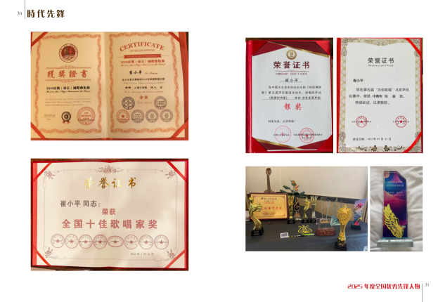 改革开放 40 周年 . 中国时代风采大地之光荣获:徳艺双馨艺术家. 2023 年北京音协与文联举办的第五届歌唱大赛获金奖.2024 年向经典致敬全国声乐大赛获银奖