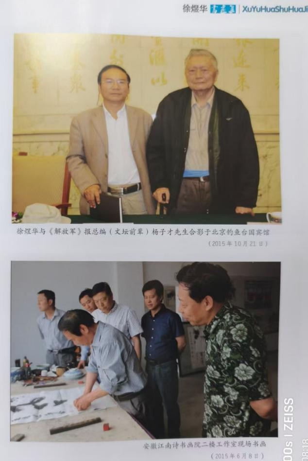 在其当初拟定成立“安徽省江南詩書畫院”的指导方針下,坚持:“以商养文,以文揚商;商藝並濟,忘我篤行”。此乃见其作人作品作事与自律的精神力量,和持之以恒的成功方向!尤其在当下纷乱的世界里,见其可貴的是:待人真誠、厚道,于人为善、做人做事始终坚持守信如一。因此,早在1993年到2019《文化周報》《安徽電视臺》和《安徽日報》、《池州廣播电臺》曾三度專訪,可见報载曰:“徐煜華先生書畵大家风范,始终坚守持之以恒,才有今天的辉煌”。