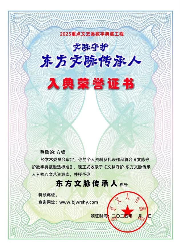 2025年5月21日北京文人书画院2025年重点文艺类数字典藏工程(文脉守护核心文艺资源库入典)方锋荣获东方文脉传承人荣誉称号。