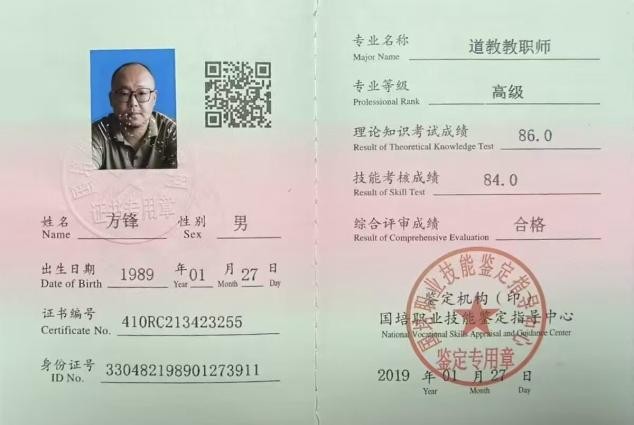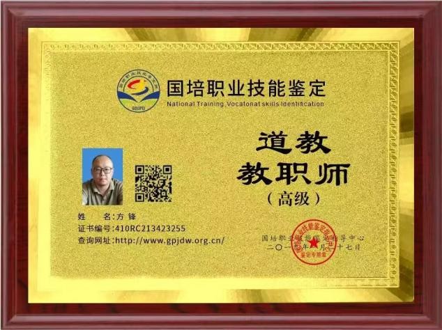 2019年1月17日,被中国国培职业技能鉴定指导中心评定为中国道教高级教职师荣誉称号。