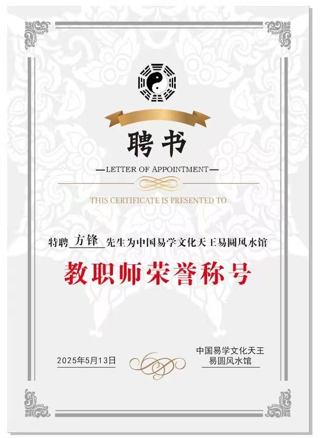 2025年5月8日被特聘为中国易学文化天王易圆风水馆教职师荣誉称号。