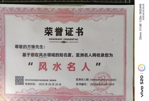 2025年5月26日方锋基于在风水领域的知名度亚洲名人网收录为(风水名人)荣誉称号。