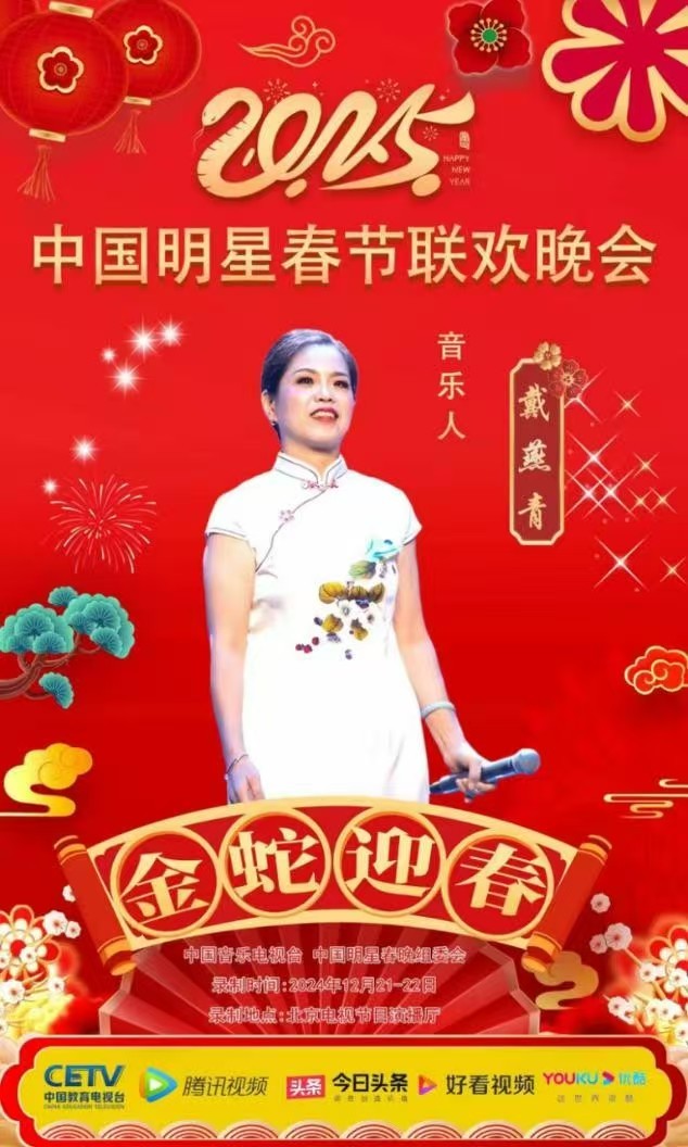 戴燕青,女,中华民族原创音乐家协会会员,中国音乐著作权协会会员,中国少数民族声乐学会会员,全国首批智库专家,非遗高级智库专家,音乐人,作品有:《感动中国》《贺进故居寄深情》《抗联精神代代传》《等你来》《东平颂歌》《本溪县红星红歌艺术团之歌》《世界戴氏宗亲总会会歌》《牡丹》《新时代中国放歌》《解放军颂歌》《故乡是潮田》《啊,祝福你我的祖国》《井冈情怀》《酒盅盅茶缸缸》《绣兜肚》《雪花飘飘》《梦里情思寄卿心》《欢欢喜喜迎新春》《长征颂歌》《中国力量》《你来桂林,我请你吃粉》原唱歌曲。多次登上央视舞台、中国教育电视台、中国音乐电视台明星春晚、中华民族中秋晚会、亚洲卫视华语原创金曲榜、央视综艺盛典、海南卫视、共工日报等平台播放。曾获感动中国“群星杯”《十大艺术之星》金奖。感动中国2021年度《十大歌手奖》。全民K歌翻唱电视歌手大赛《K歌人气金奖》。举杯邀明月一一2021全民电视中秋晚会《优秀奖》。2021年感动中国一一第1届“群星杯”声乐电视大赛《铜号奖》。“乐为杯全国中老年直播达人大赛”《优秀奖》。2022年感动中国第2届“群星杯”声乐电视大赛《铜奖》。“歌声里的中国”2022全国大型声乐大赛《优秀奖》。“万家灯火一一文艺星光奖声乐大赛”《优秀奖》。“群文杯”第13届声乐大赛《铜奖》。