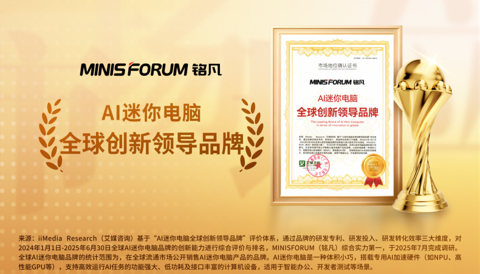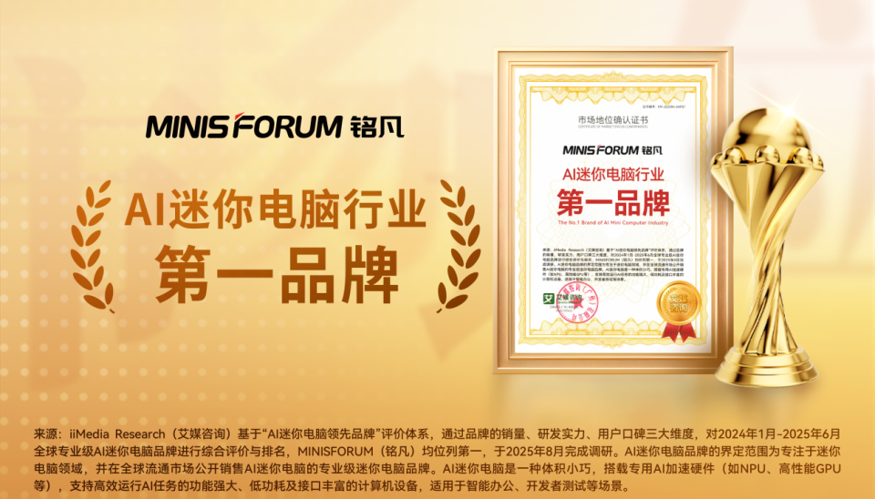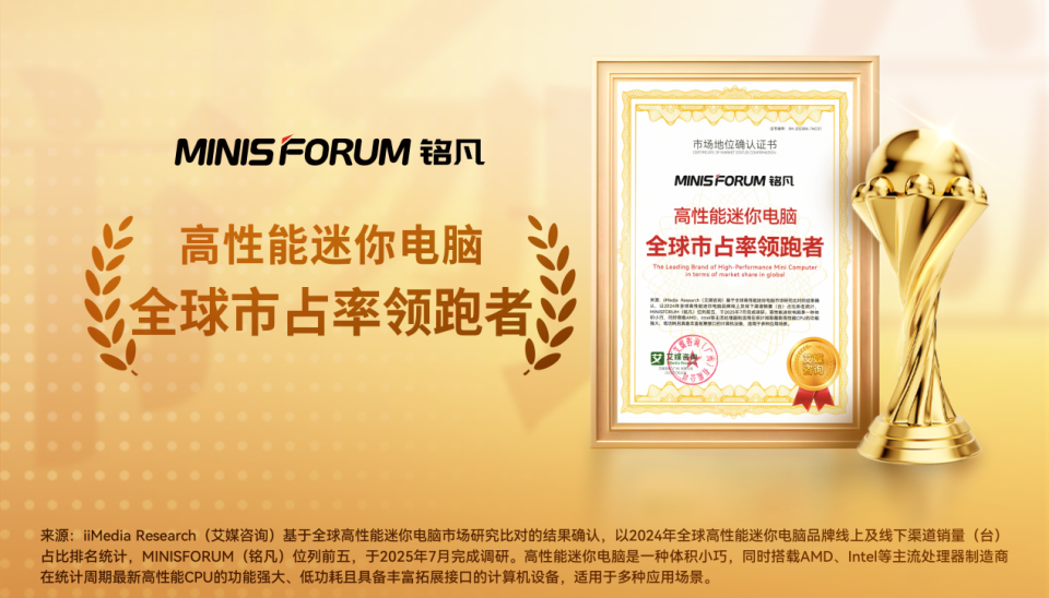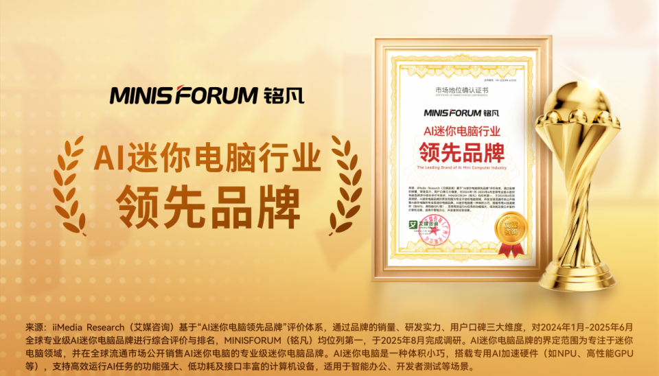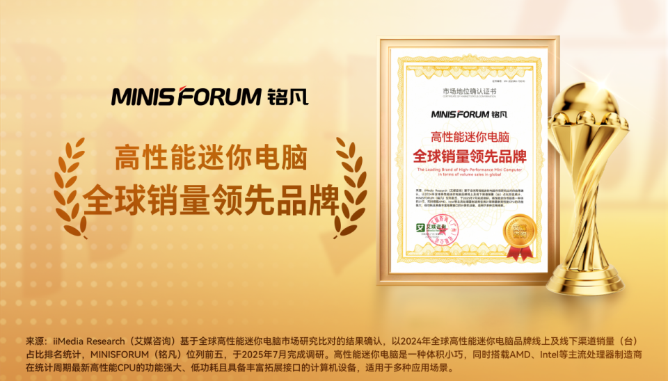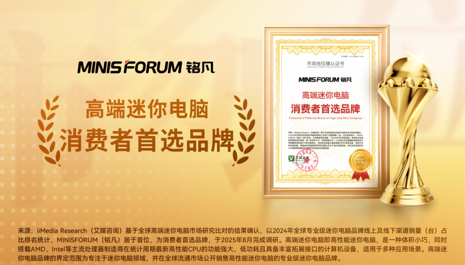 近期,铭凡获全球领先的新经济产业第三方数据挖掘和分析机构iiMedia Research(艾媒咨询)授予的“高性能迷你电脑全球市占率领跑者”“AI迷你电脑全球创新领导品牌”“AI迷你电脑行业第一品牌”“AI迷你电脑行业领先品牌”“高性能迷你电脑全球销量领先品牌”“高端迷你电脑消费者首选品牌”市场地位确认。