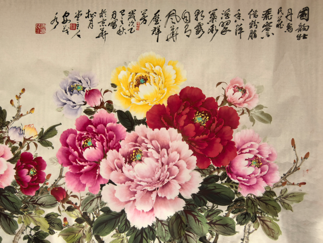 -笔力之刚:题画字以中锋行笔,笔画如“屋漏痕”般沉实,转折处见“锥画沙”的劲挺,比如《国色耀春晖》的题款,“国色”二字雄健如峰,“春晖”二字秀逸如溪;