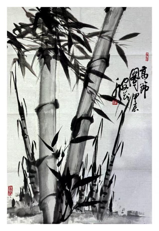 -骨之刚:花茎以焦墨中锋勾勒,带着山水皴法的劲挺,枝叶用枯笔皴擦,与柔润花瓣形成“枯润相生”的张力。