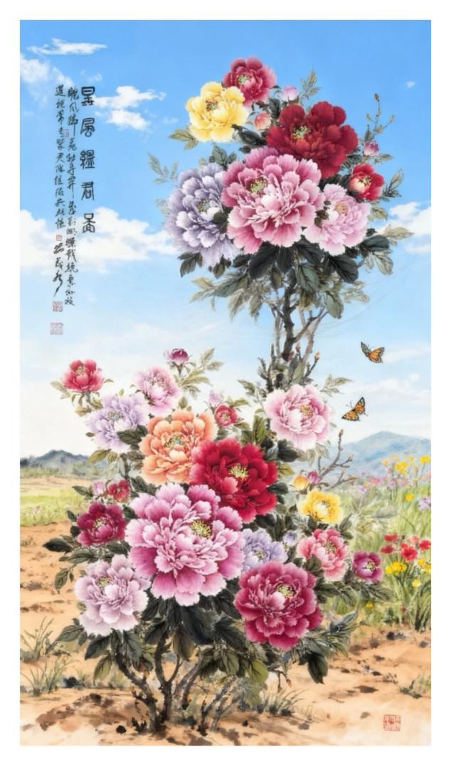 更难得的是,他将“天地共生”的山水意识注入牡丹:画面里,牡丹扎根暖土、仰对晴空,远山淡墨铺就朦胧,彩蝶振翅欲落——让牡丹脱离了孤立的静物,成了“与天地同春”的生命载体。题字“国色耀春晖”,恰是他对“牡丹非仅花之艳,更是家国气象、生命蓬勃”的注解。