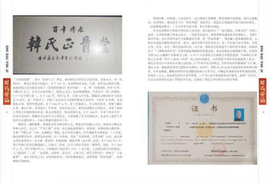 等。采用百家之长,更加完善韩氏正骨技艺,形成了韩纸正骨技艺的独特理论体系。第五代韩慧芸。韩达财独生女, 生于 1996 年,毕业于河北大学。完成学业同时,跟随其父自幼学习正骨技艺,目前掌握了其父全部技术,也成功入选西宁市湟中区非遗传承人,目前主要搞非遗传承工作。