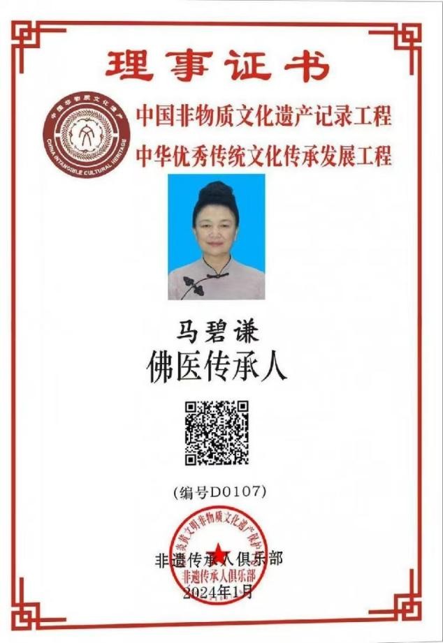 马碧谦,女,汉族,是吉林省北国江城人,佛医传承人。现担任世界非物质文化遗产研究院特聘院士、中科院生命科学教授、沈阳妙吉祥调理养生馆负责人等多项社会职务。在 40 余年行医修行的实践中,马碧谦潜心学思践悟,多年精心搜集、整理和研究中华传统文化,善用佛医统一、药食同源等方法,以三学、四谛、五蕴等佛学理论为指导,以证悟论治、调理心神、注重饮食为特征,以身、心调理与诊疗并重为特色,在治疗心脑血管、胃肠、肝胆、疼痛、心理异常、精神障碍等身心杂病方面均有独到之处。