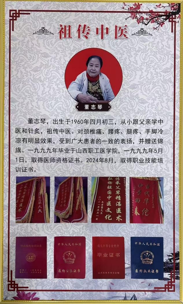 深知“学然后知不足”的董志琴,从未满足于家学传承的积累。1999年,她凭借不懈努力考入山西职工医学院,系统学习现代医学理论与传统中医诊疗知识,实现了传统技艺与现代医学的深度融合。同年5月1日,她顺利取得医师资格证书,正式踏上独立行医的征程。此后二十余年间,她始终保持着旺盛的学习热情,紧跟中医发展前沿,不断钻研新技术、探索新方法。2024年8月,她又一举拿下职业技能培训证书、中华人民共和国医师黄铬证书、山西省教育委员会制成人中等专业教育毕业证书及医师执业证书等多项资质。这一本本证书,不仅是国家对她专业能力的权威认证,更凝聚着她对中医事业精益求精的不懈追求。