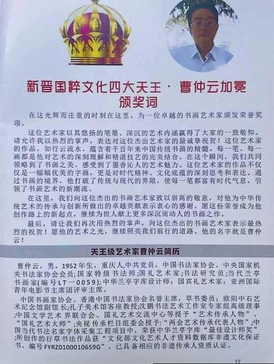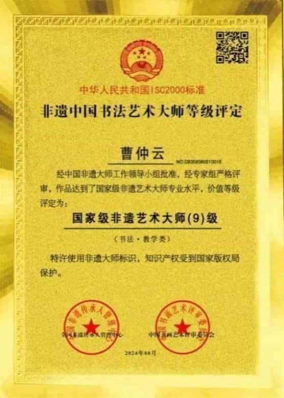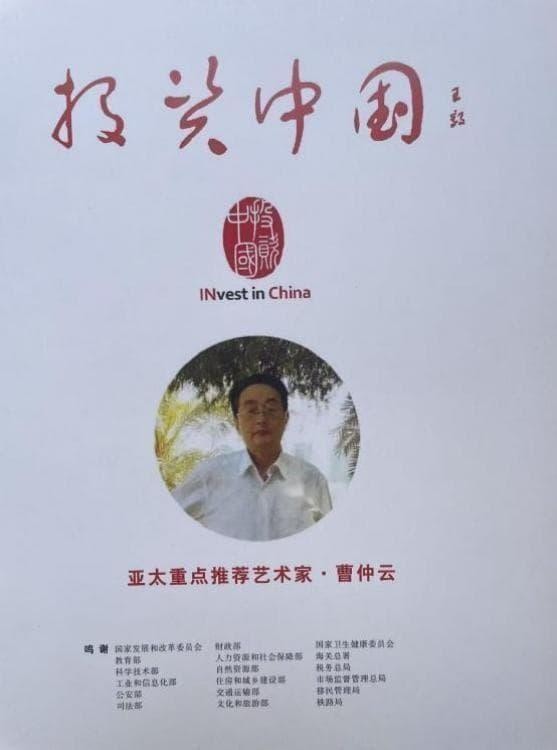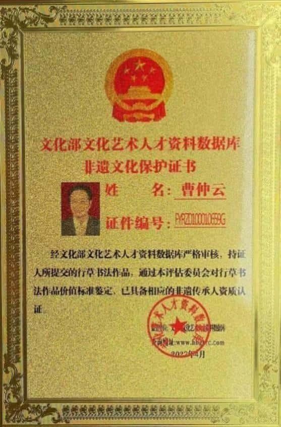 文化部授予行草书法非遗传承人; 兰亭字库组委会授予最佳设计 师;央视华夏儿女栏目组授予“《华夏儿女》优秀艺术传承之星”;2023 年 6 月:热烈祝贺人民日报创刊 75 周年, 由铁凝主编, 登载“党旗下的艺术领袖, 书 画泰斗”两个版面;《传承经典》,“中国书画文化传承人黄永玉 、曹 仲云艺术传纪录 ”,由铁凝作序, 国家版本馆典藏版0018 号;其作品由人民大会 堂、故宫博物院收藏;欧阳中石、权希军老师健在时,共同出版了《中 国书法艺魂三大家》,由中国国际出版社出版发行; 2022年12月, 由王毅题写《投资中国》书名, 向亚太重点 推荐艺术家曹仲云,由中国国际出版社 在亚太地区发行;中国文联 授予“ 中国书画终生成就奖 ” ; 中国艺 术名家交流中心组委会授予 “ 中国当代世界级艺术家 ” ;联合国教 科文组织等授予“2023 年度全 球十大风云人物 ”;中国文联授予当代书画界新领军人物(由铁凝签发)。