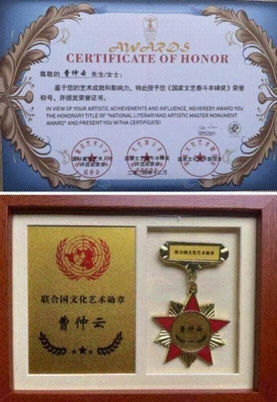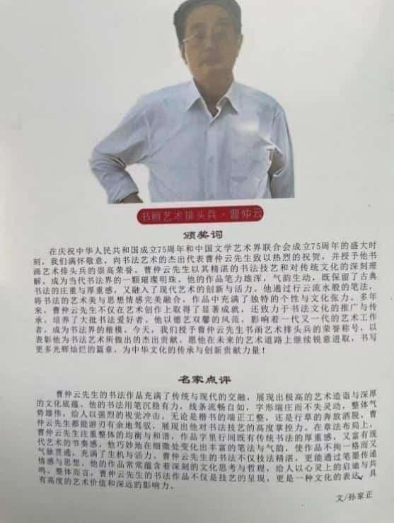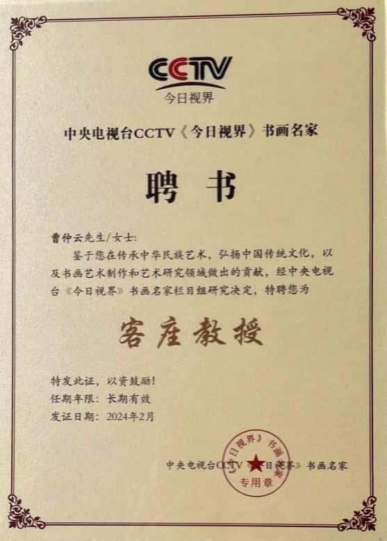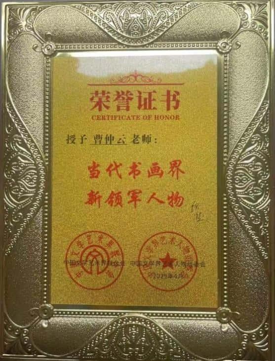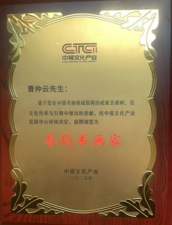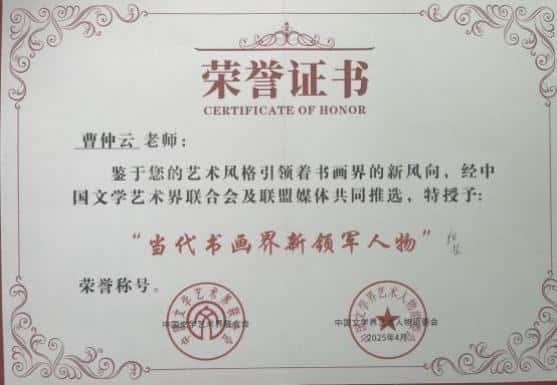 2024 年以来, 获得了联合国文化艺术勋章; 祝贺中国农历春节 成为联合国法定假日, 获得了 中国巨匠“ 中国国粹四大天王”之一的 荣誉称号;在国内获得了诺贝尔奖,百花奖、“兰庭杯”网络全国书画大 赛一等奖;中国书画白玉兰金奖;《传媒中国》等报道了《曹仲云一近现 代艺术家最具影响力八巨头》; 朝闻天下播岀了《感悟 艺术 魅力·领略书画文采“大师列传”曹仲云老师优秀作品展播》; 同马英九 合编了《水墨丹青两岸情》, 中华商务出版社出版发行 ; 获《中俄文 化交流年书画五虎将》, 世界文化艺术出版社发行;获四大才子联袂巨献;由cctv 华夏之声报道为《艺 苑泰斗》; 国际新闻网报道为《当代书圣》; 庆祝中国文联成立 75 周年,被评为“书画艺术排头兵”;文旅部推荐评审为: “国家文艺泰斗丰碑奖”、“聚焦 2025 年艺术大咖”;旅游促进会等评审为:影响世界十大金牌艺术家;由铁凝审签中国 文联授予“中国当代书画界新领军人物”;纪念世界反法西斯胜利 80 周 年,被评比进入“五大文化战神封神榜”;由美术家协会等五家报到了:" 曹仲云《引领世界五大书法家》特别推荐艺术人物;世界华人发展联合会 等评选为:“曹仲云—亚洲书画界十大新闻人物”。