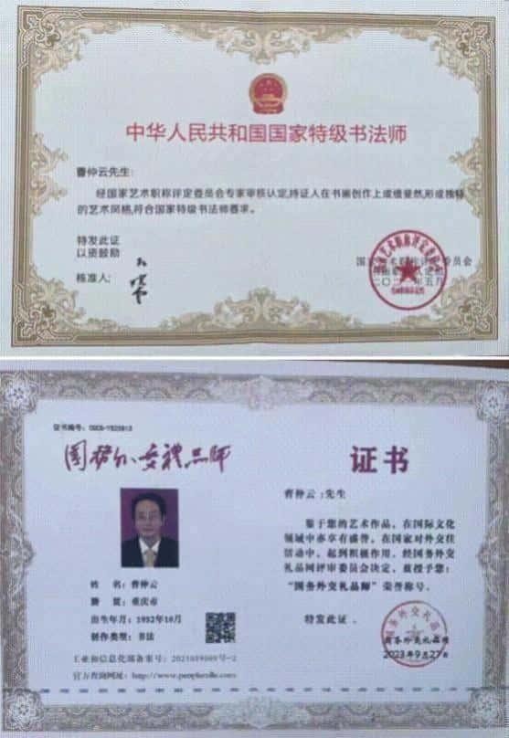 曹仲云, 男,重庆市人, 1952 年生, 党员,中国书法家协会会员 、名誉主席;中国书画艺术非遗传承常务副主席;国家特级书法师; 国家级非遗艺术大师九级; 国务外交礼品师; 中央电视台、香港电视台 签约艺术家; cctv 客座教授;世界非物质文化遗产 研究院副院长; 中国翰林书画院院士; 中国书法家研究协会副主席;欧阳 中石艺术 纪念馆副馆长; 两岸文化交流形象大使。
