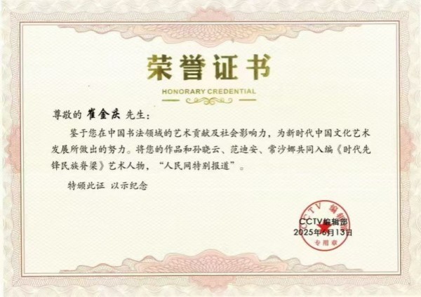 6 月 13 日,人民网以 “《时代先锋 民族脊梁》艺术人物” 为题,对崔金庆、孙晓云、范迪安、常沙娜等艺术家的卓越艺术成就进行了专题报道。在此次报道中,崔金庆的十幅书法作品,包括《天顺人和》《志存高远》等精彩之作得以发表,其书法笔力雄健、气势恢宏,展现出独特的艺术魅力与深厚的文化底蕴。