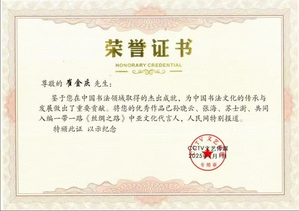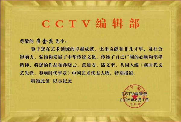 2022年10月13 日有 CCTV 央视传媒组委推出《讲好中国故事塑造中国文化》暨特别推荐创意传播艺术大使,崔金庆荣誉称号。