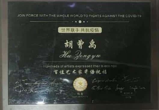 2020 年胡曾禹被国际名人百科授予中国最美书画家。在世界抗疫 中其书法祝语被选百家之中并授予有十个大使馆大使签名奖牌。