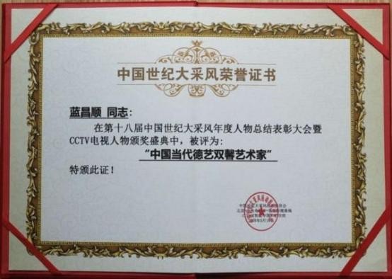 2018 年 5 月 18 日在第十八届中华世纪大采风年度总结表彰大会暨 CCTV 电视人物颁奖盛典荣获“中国当代德艺双馨艺术家”;