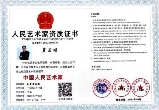 2023 年 10 月荣获《人民艺术家资质证书》被授予“中国人民艺术家”并评定书法作品市场润格为每平方尺为 20000 元。