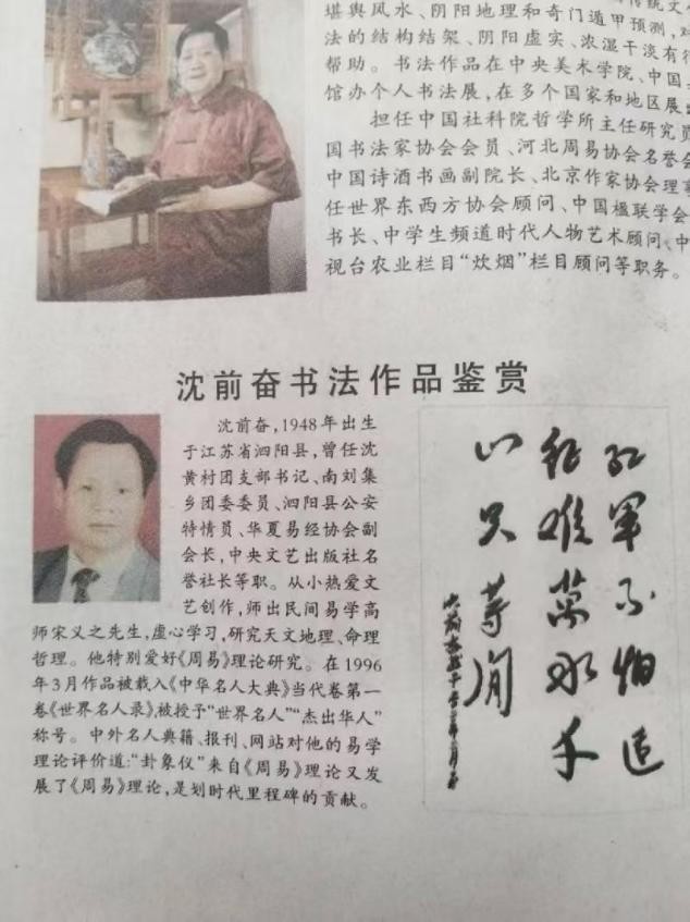 名人沈前奋,中国江苏人,1948年农历8月13日寅时出生于泗阳县六塘河北沈黄庄一个农民家庭。现被许多学术单位聘请任职,华夏易经协会副会长,中央文艺出版社终身名誉社长,中国文学研究院终身名誉院长,博士生导师,中国政协诗书画院副院长,世界艺术学会终身名誉主席兼终身学术顾问。他从小热爱文艺,师出民间高师宋义之先生百岁老人关门弟子!虚心学习:天文,地理,命理学,特别爱好马克思主义哲学社会科学和周易理论研究,学用结合。经过几十年学习与社会实践总结,终于在一九九六年3月28日晚9时,发明了震惊世界的“卦象仪。”获得了国家专利权保护!又撰写了《卦象仪发明与易理新说》一书。获得国际科学新学术论文金奖!被载入中华名人大典第一卷,《世界名人录》授沈前奋,世界名人,杰出华人称号!随后国内外新闻媒体,报刊网站接连不断学习他写的科学内容,宣传他的业绩!《中华民族的榜样》,《时代娇傲》,《中外格言》等上百部典藏巨著,编辑入写他的论文,诗词歌赋,生活照片。中国国史日史编修馆收藏。中国七千多年八卦发展史,根据先天八卦伏羲,后天八卦文王,今天的前奋发明卦象仪,历史发展史定位是第三里程碑!是无可争议的历史事实。他在天文学上也有人类历史上前所未有科学推测:行星和恒星是互相演变的,《地球将会象太阳一样发热发光》。在生命科学上,计划生育基本国策,发表了全人类都认可的科学论文;《六人化家庭人口论》。人类二百年左右可进入共主义社会。他把学习传统文化,中外文化结合起来。他高瞻远瞩!宇宙观,人生观!各界人民群众都愿意和他交朋友!他现在已经得到国家信任,可代表中国文化在国际上交流。他的人格魅力受到国际奥委会利用,2008年,国际奥委会写信给他,要他声援奥运!他接到信函,在十几分钟,就用书法艺术写一副对联:上联,迎奥运光荣!下联,反奥运可耻!接着又写一首诗:国际奥运二0八,隆重举办中华。高举红旗迎奥运,迎接圣火爱国家。奥委会发表出去,立即收到效果。他的人格魅力学术权威现在已经产生了名人效应!但他只声张正义,打击歪门邪道。是多年前的泗阳县公安特情员。他的历史文化遗产已受国家保户!将成为全人类向往的生活景区。