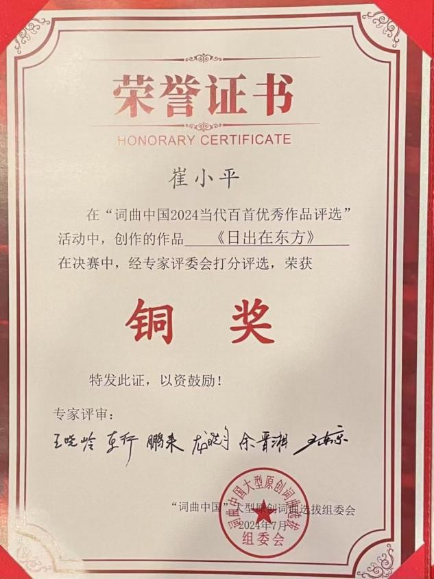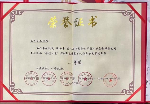 2023年北京音协与文联举办的第五届歌唱大赛获金奖.2024年向经典致敬全国声乐大赛获银奖2023词曲中国获歌曲创作《日出东方》铜奖2024年京津冀三地声乐比赛获得银奖.央视《星光达人秀》声乐比赛获得二等奖.北京电视台服饰文化舞蹈大赛获二等奖.2025年参加长沙国际文化艺术盛典大赛.受到新西兰前女总理珍妮.希普利的接见与喜爱.并授予最受欢迎的全国十大歌唱家.2025年参加中国国际教育电视台主办的:世界和平天使音乐会