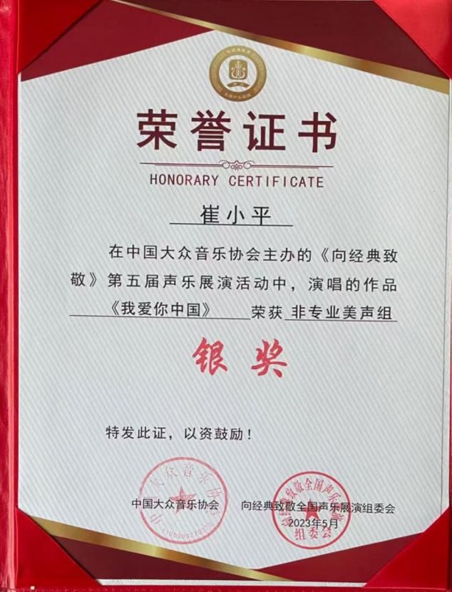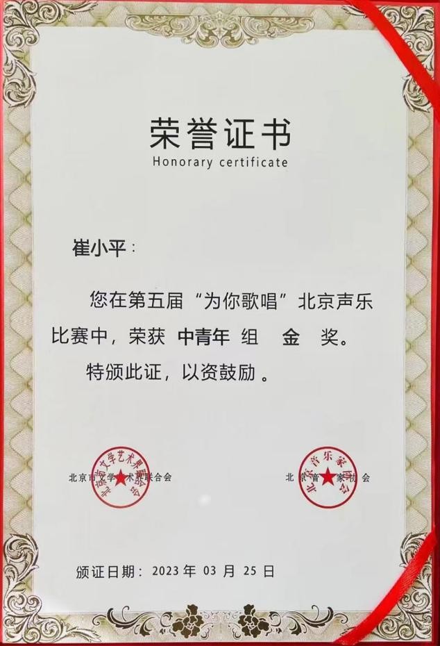 崔小平,北京音乐家协会会员,昌平音乐家协会理事,全国十佳女高音歌唱家,国家一级舞美设计师,中国服装设计师协会艺术专业委员会评审专家