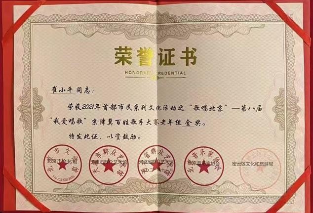 北京文联.音协第八届京. 津.冀地区《我爱歌唱》声乐大赛获得金奖.