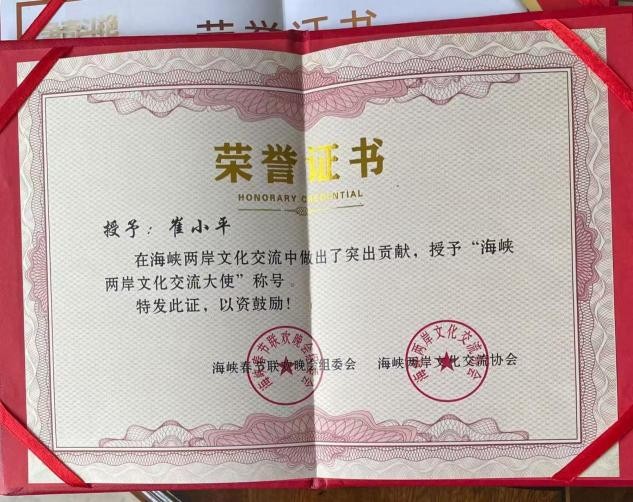 连续多年参加中央电视台第九. 十. 十一届海峡春晚.荣获海峡两岸文化交流大使称号.