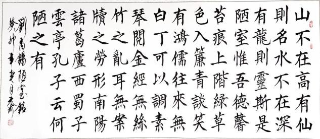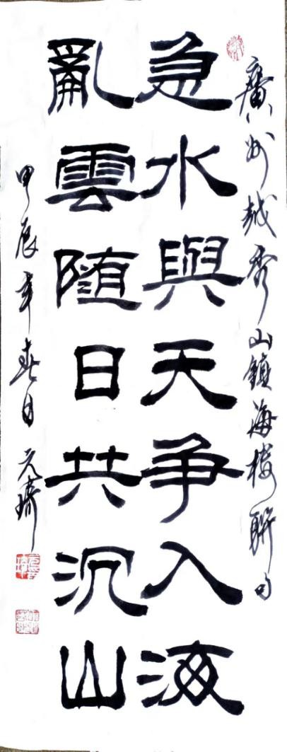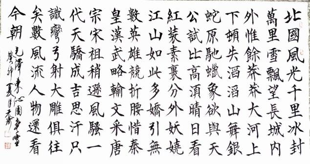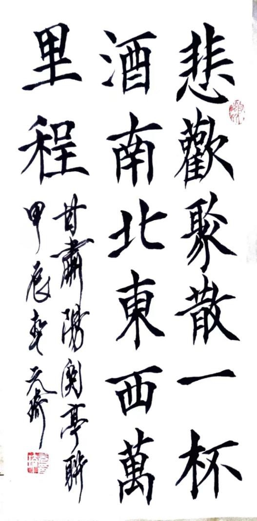 说说行书。那还得从书圣王羲之入手,反复学习他传世法帖“兰亭集序”,还有怀仁集王羲之圣教序。在学之过程中越发觉得其深不可测,高不可攀。无论笔法、结字、章法,都属上乘,真乃神品也。在学“二王”的同时,我又研习了宋人书风,诸如苏黄、米、蔡等的一些代表作品,尤其是米字的沉着痛快,刷字格局,给了我很好的书写启发,从而形成了我如今的秀雄合一之书风。