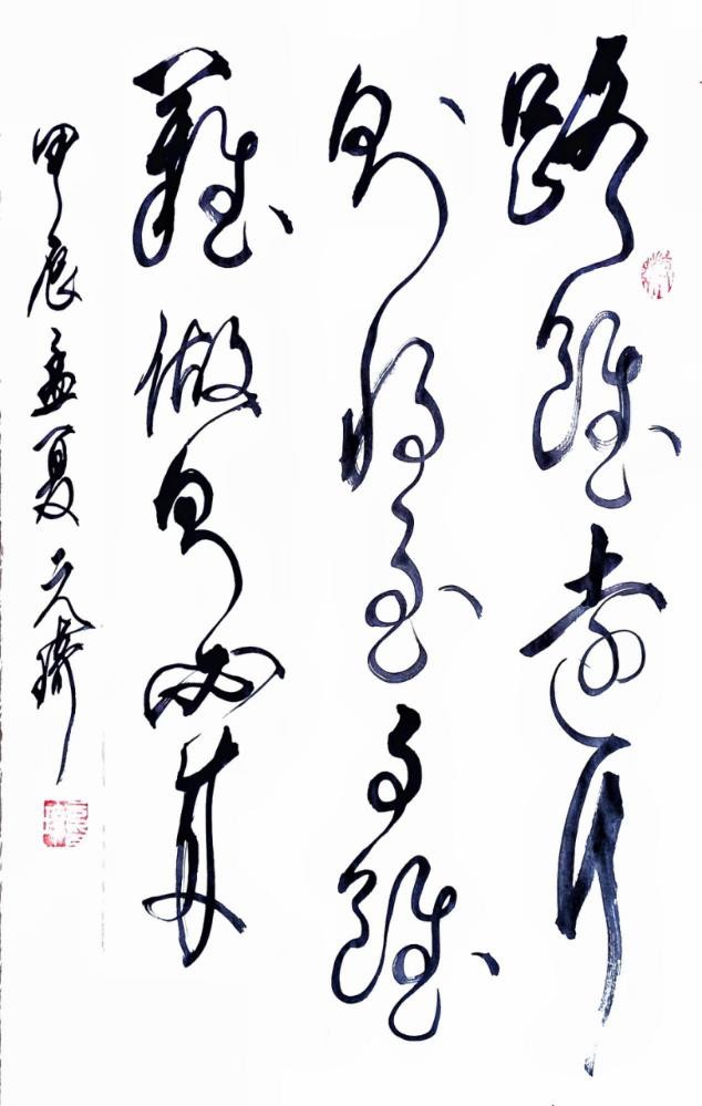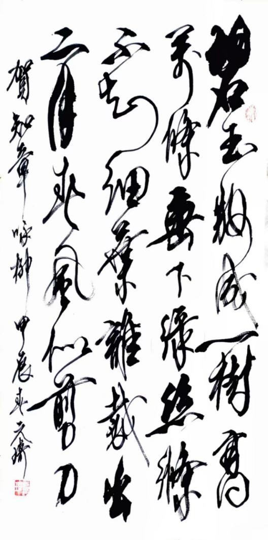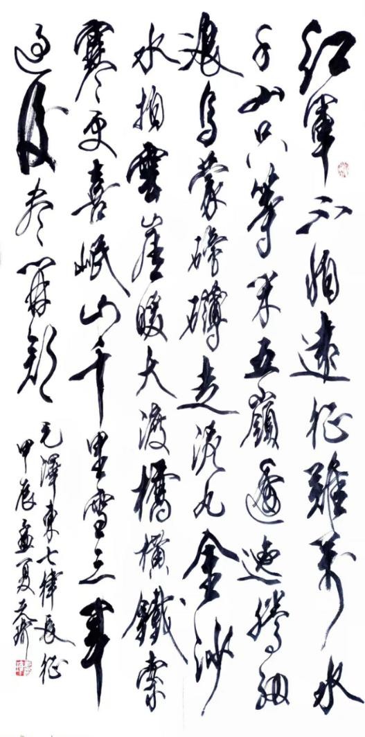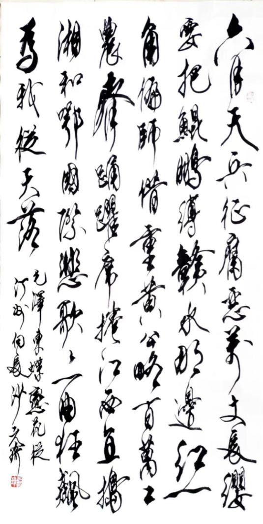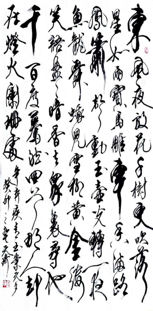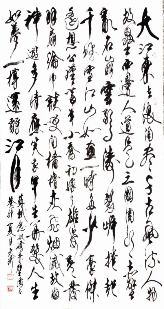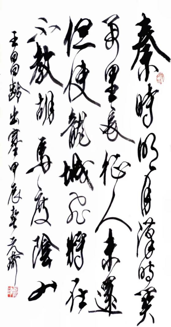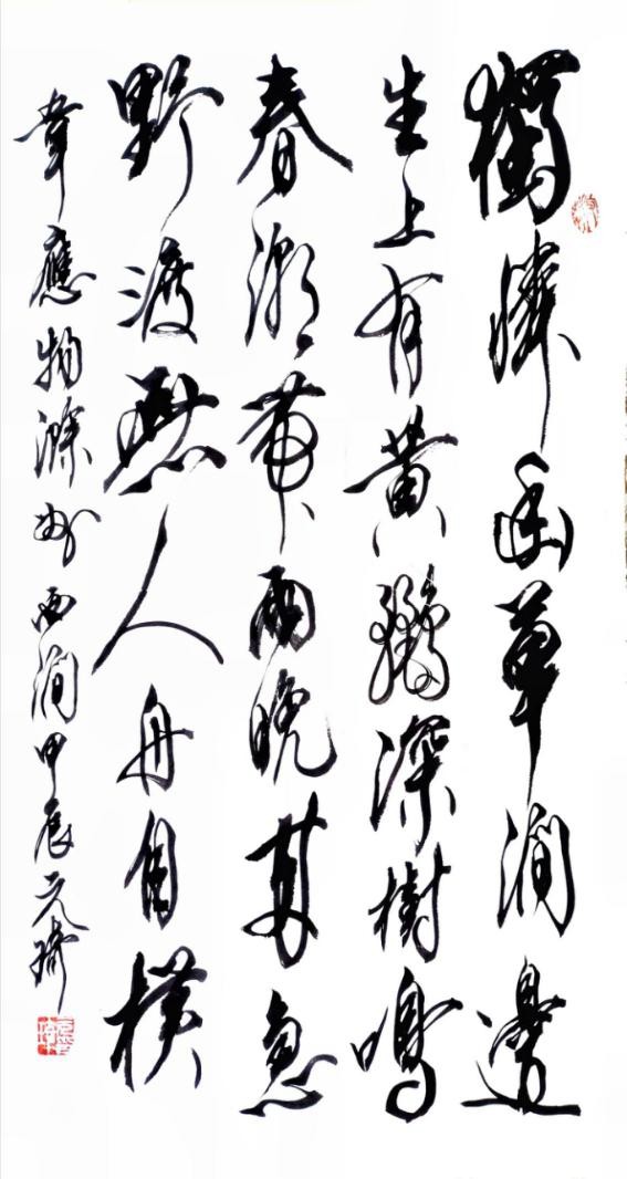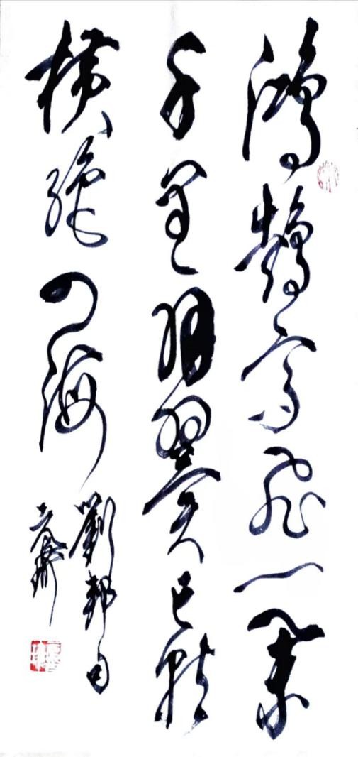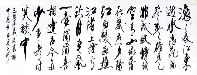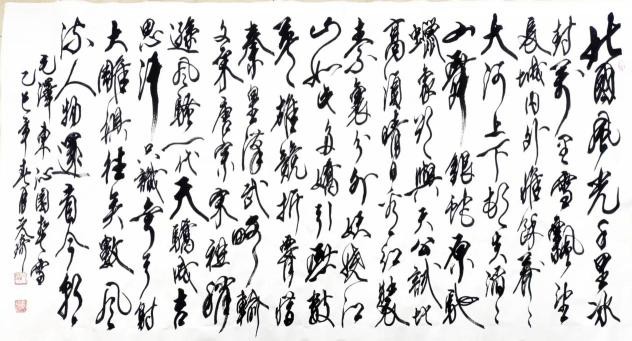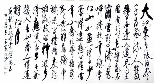 说说草书。我从晋人入手,尤为极赏“二王”法书,遍临“十七帖”等诸帖,数番揣摩其笔意,领会其精神,从中获益良多。准确讲,我从唐人孙过庭“书谱”中得力颇多,受到了精辟书论的熏陶和出色笔法的影响,从而使我在草书创作的道路上,稳步前行,日臻完善。