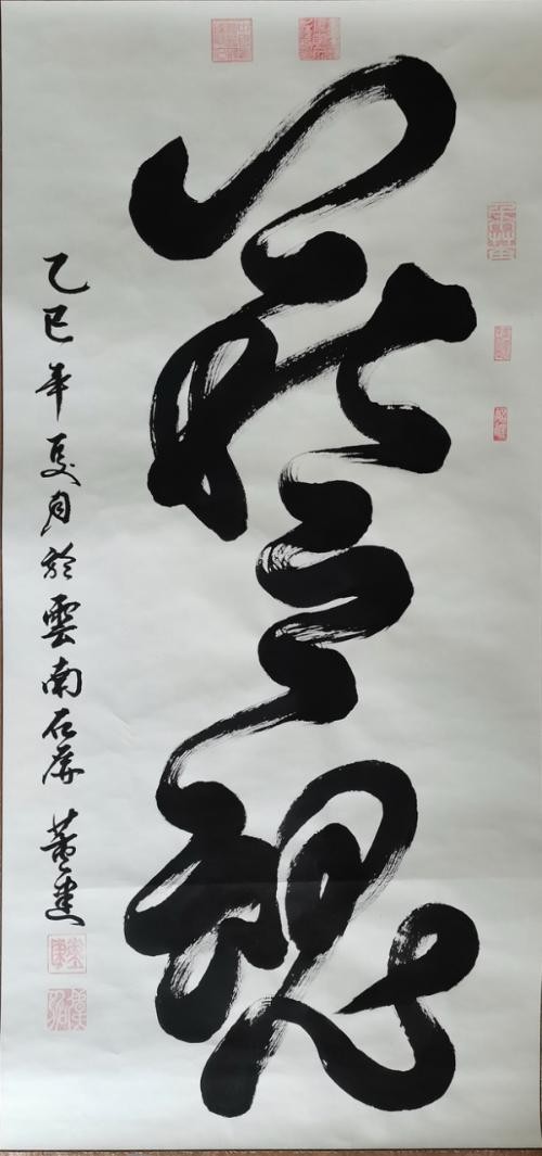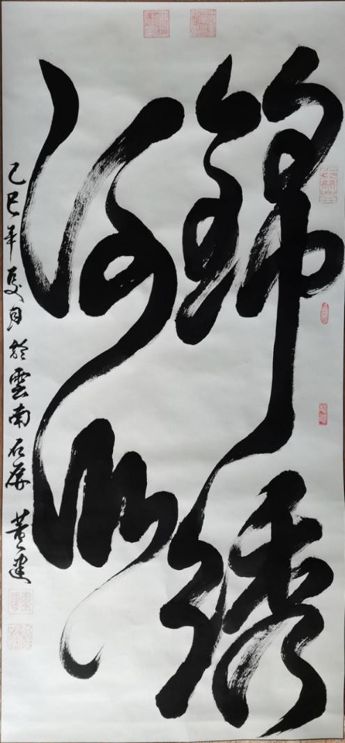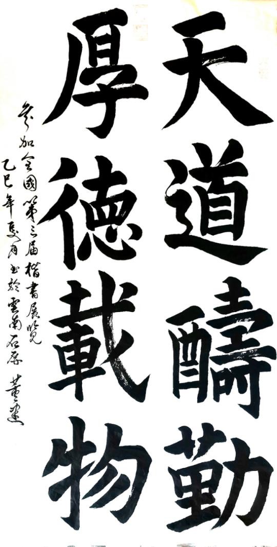 翰墨丹青绘石屏,笔耕不辍报桑梓。董建先生自云南石屏走出,其艺术生命深深扎根于中华书法千年沃土。其书艺之路,始于家学启蒙,经数十年行政工作磨砺而不辍,终在退休后绽放异彩,董建先生幼承庭训,其书学之基极为深厚纯正。其习书路径遵循古典法则,于楷书深研颜鲁公之雄浑、柳诚悬之骨力、欧阳率更之险峻,汲取唐代法度精华。行草则直溯“二王”正脉,上追晋韵,复浸淫于张旭之狂逸、怀素之奔放、米芾之“八面出锋”,于动态中求平衡。隶书宗法汉碑古拙气象,篆书则主攻小篆之圆劲婉通。这种“五体兼修”的深厚功力,使其创作具备坚实的传统支撑与丰富的笔墨语言,非徒具形式者可比。其楷书作品入选全国第三届楷书展览,正是其深研唐楷正脉、法度精严的明证。