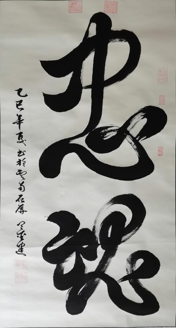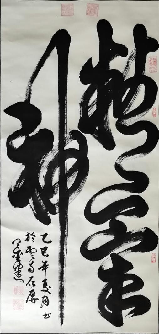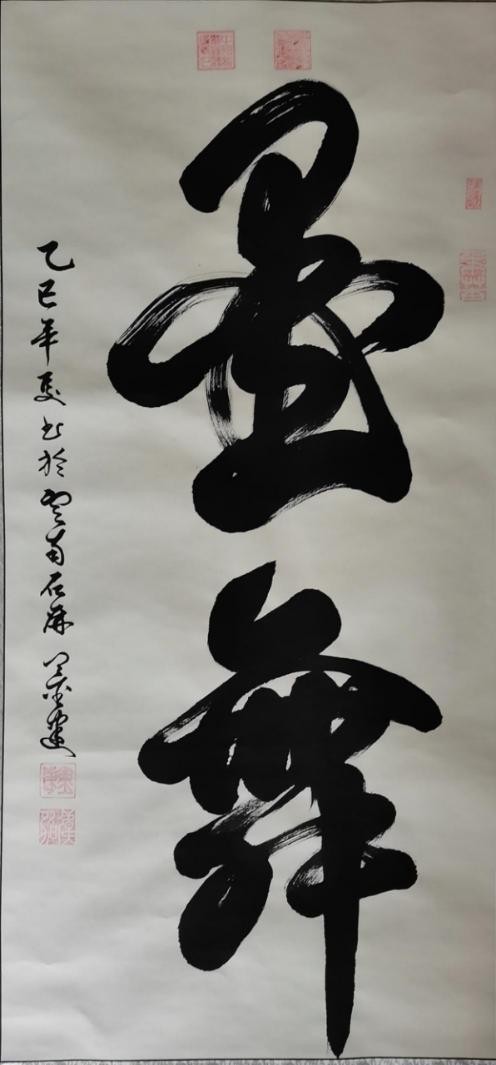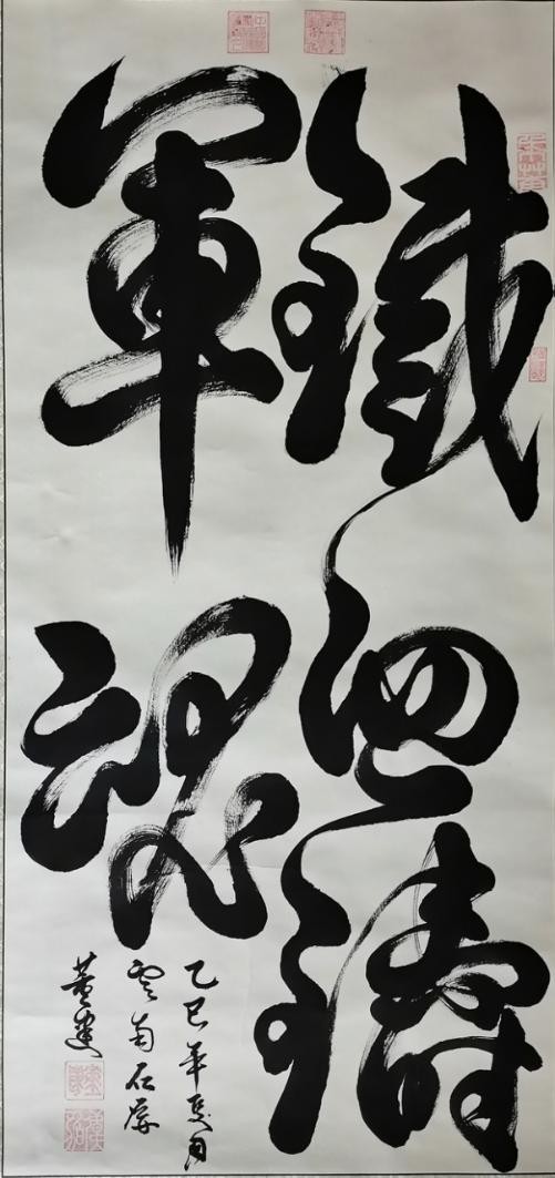 在传统滋养下,董先生逐渐淬炼出“雄浑质朴,自然率真”的个人书风。其雄浑,非徒然粗犷,而是笔力沉实、气象开阔,如楷书《百寿图》之厚重端方;其质朴,在于不事雕琢,以本真性情入书,流露于线条的坦荡与结构的疏朗;其率真,则见于行草创作时的挥洒自如,情感驱动笔墨,如草书《龙腾虎跃》之酣畅淋漓,意象飞动。这种风格,既是对颜筋柳骨内在力量的继承,也是对“二王”风流中自然天趣的呼应,更融入了其个人性情的本真流露,在传统框架内实现了“别具一格”的艺术表达。