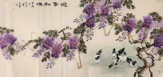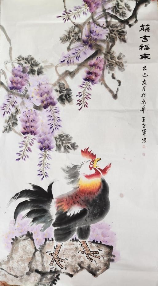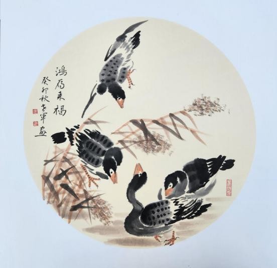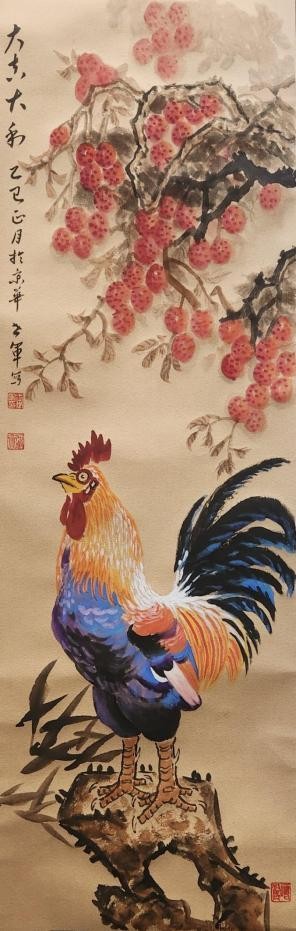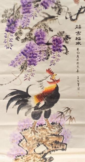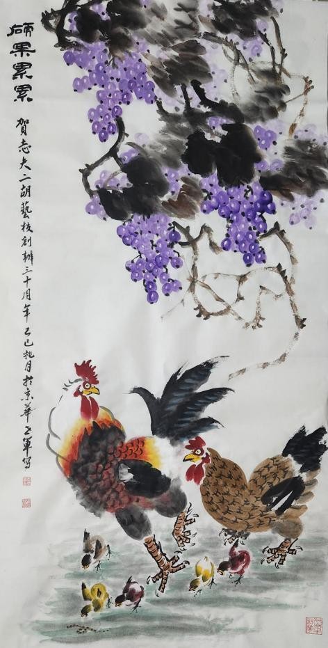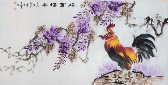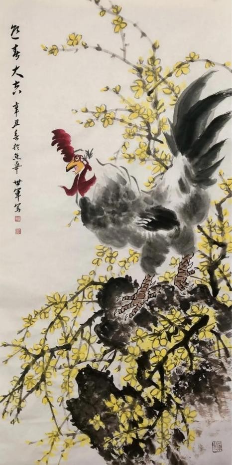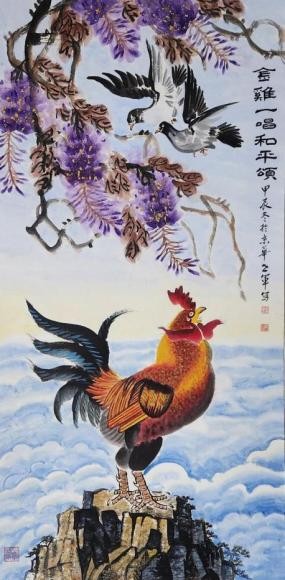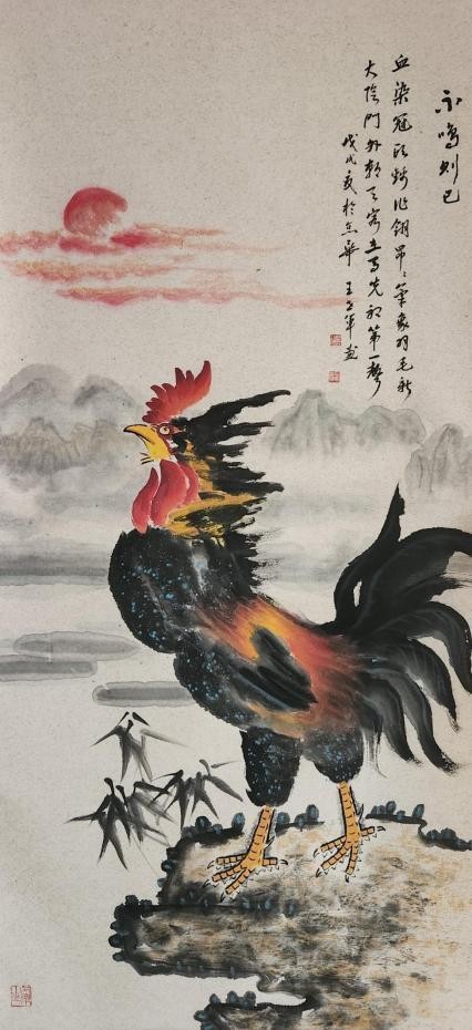 其绘画风格功底深厚、技法娴熟,笔墨灵动间构图精巧,韵味悠长。尤为知名的鸡主题画作,将 “文、武、勇、仁、信” 五德融入,借形神兼具的禽鸟之姿传递传统美德,以精心排布的墨色线条触动观者内心。落笔大胆细腻相济,藏锋逆锋自如转换,于干湿浓淡、大小粗细的变化对比中,写意精髓淋漓尽显,方寸之间,满盈传统美学与当代艺术表达碰撞的火花。