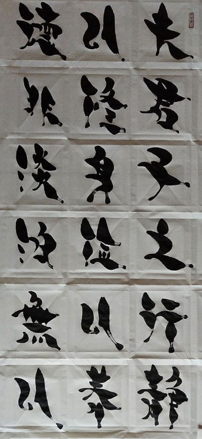 朱万忠创始的《柳叶体》书法被誉为“五体绝伦、六书精妙”,融合篆隶精髓与魏晋风骨,兼具金石之气与动态韵律。其特点包括: