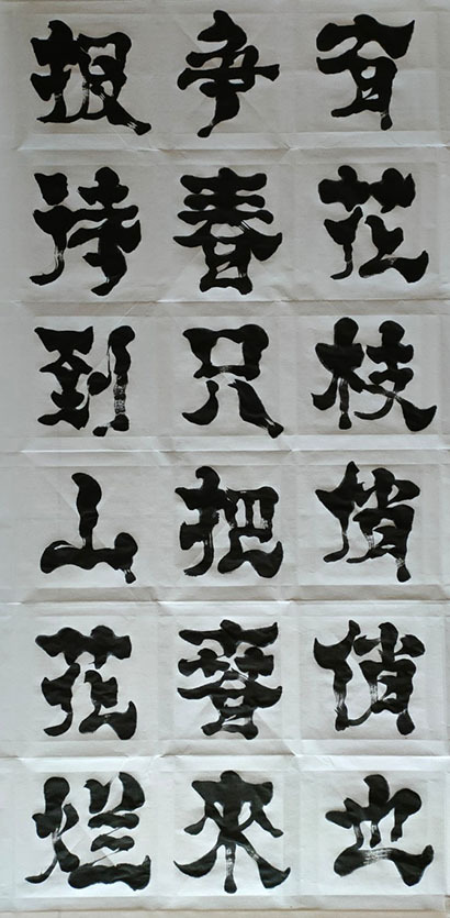 但我从小就特别的喜欢毛笔书法,上小学二年级的我,已经就给全校写字课上给同学们写投方格的毛笔正楷书法。学校的两个大黑板报,每周都要换写新的版报,从二年级到五年级都是我给办刊书写。小学毕业了我一生的学业也完了。当时只有十二三岁吧,家里没劳力,当时社会实行的是“按劳分配”,多劳的多得,少劳的少得,不劳的不得。十二三岁集体不给我订劳力,那时候农村的人们才真正的淳朴,不到十六岁就连“半劳”也不给我订。集体的老人们说:干脆放羊去吧!去打个羊梢子还可以,订不了劳力就不要给订了,每天计给“七分工”。因为全劳是“十二分工”。古人云:牧羊三年赐官不做。一转眼之间十六岁了,改革开放土地承包到户,九口人分配承包到了(三十二亩地)。土地承包到户,粮食连年丰收。