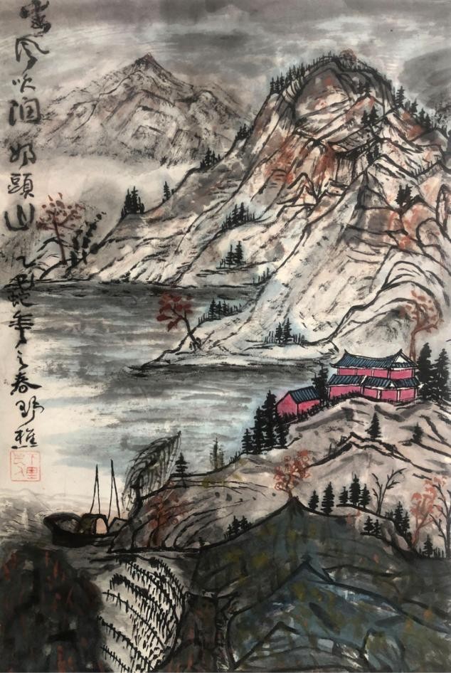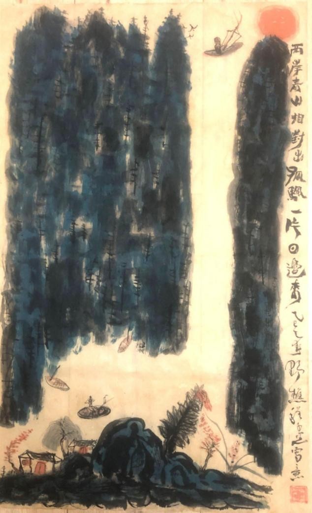 程涌书画之"奇",非猎奇炫技之奇,而是视角与构想的异质性表达。观其《山居秋暝》系列,山非山之常态,水非水之常形,却自有一番"横看成岭侧成峰"的妙趣。这种"奇"源自艺术家对物象本质的深度凝视与内心投射,犹如石涛"搜尽奇峰打草稿"的创作状态,将眼中山水转化为胸中丘壑。在《琼江渔歌图》中,程涌以夸张变形的渔舟、近乎抽象的波浪线条,构建出一个既熟悉又陌生的水墨世界,这种视觉陌生化处理打破了观者的惯性期待,创造出"似与不似之间"的艺术张力。其"奇"更体现在材料运用的不拘一格——农家土纸、自制烟墨、秃笔焦墨皆可入画,这种对传统书画材料神圣性的消解,恰是其艺术观念前卫性的物质呈现。